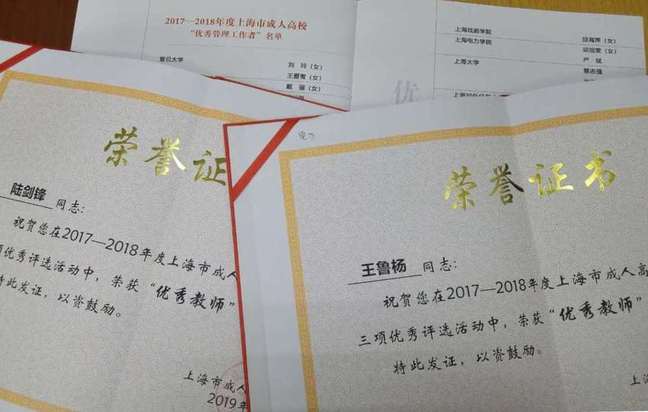 来自上海震旦教学站点的庄培艳同学、电校教学站点的李白淳同学获 “2017-2018年度上海市成人高校优秀学员”称号;继教学院邱旭雯、严斌获 “2017-2018年度上海市成人高校优秀管理工作者”称号;电自学院王鲁杨、能机学院陆剑锋获“2017-2018年度上海市成人高校优秀教师”称号;上海市电校教学站点李嫄、安徽函授站傅晓获“2017-2018年度上海市成人高校优秀班主任”称号。这些奖项的获得既是社会对我校院成人学历教育办学质量的认可,也是我校社会影响力不断提升的印证。